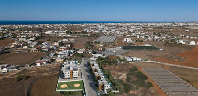 Two Bedroom Apartment with Common Rooftop Pool in Deryneia area, Famagusta. The property is situated in a very quiet neighborhood in Deryneia, which is around 5 minutes away from Paralimni and Protaras and 10 minutes away from the brand new Marina of Ayia Napa. It can be added that the nearest sea is Kapparis, which is around 8 minutes away.