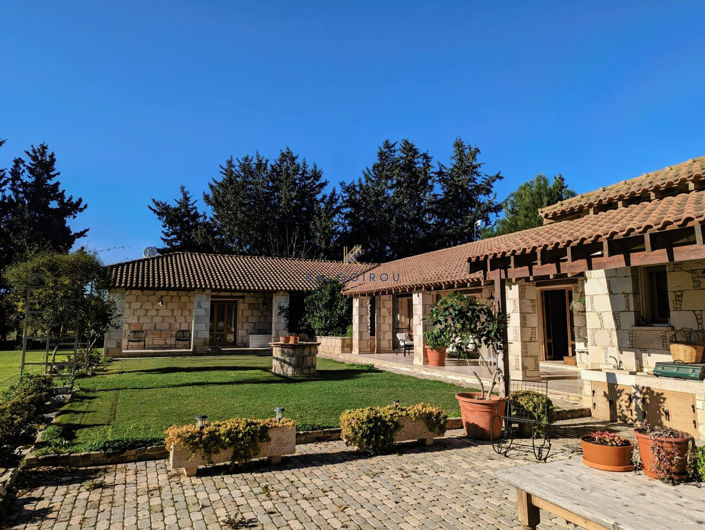 This unique Bungalow of 220sqm is made of wood and stone constructed in a plot of 5.500sqm. It comprises of an open plan kitchen with marble countertops, living room with fireplace, dining area, a master bathroom with shower and bathtub, 4 bedrooms, one of them is en suite. In addition, the property offers a utility house that can be used as a gym or guest house.
