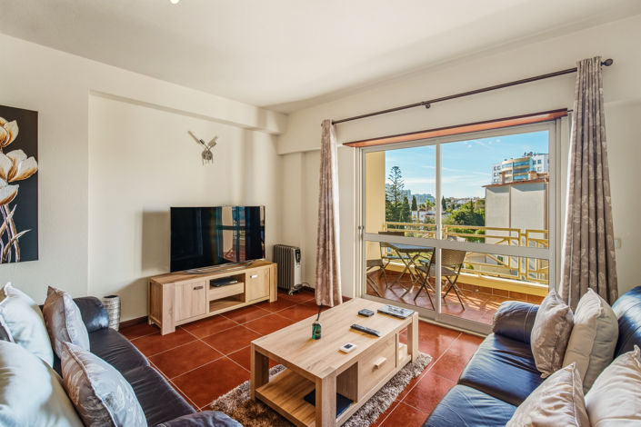 The apartment opens into a welcoming entrance hall that leads through to a bright, open-plan living and dining area. Large sliding doors open onto a spacious southwest-facing terrace, the perfect place to enjoy afternoon and evening sunshine while taking in views across to Boavista Golf Course in the distance.