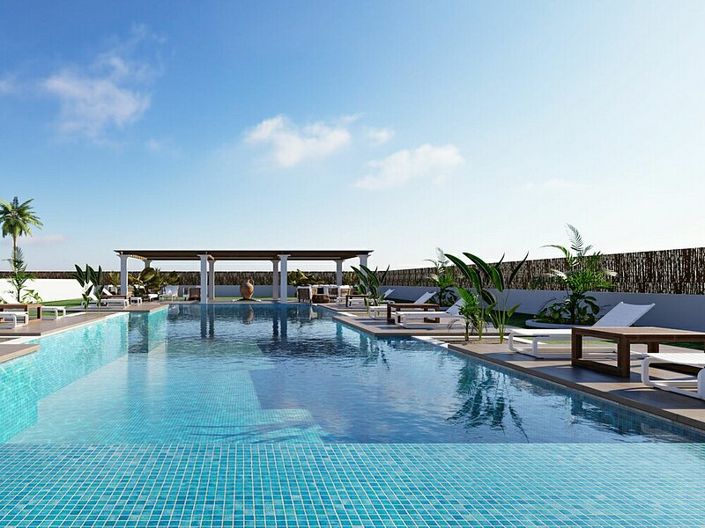 Located on a prestigious golf course, this urbanization is also close to many cafes and restaurants in Los Alcazares and the surrounding areas. The gated and secure community features an incredible swimming pool with various ambiances, including a beach area, a lounge zone within the pool, and a solarium, all surrounded by sustainable green spaces.