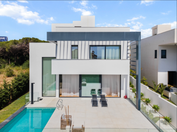 The villa is a contemporary three-level home designed with clean architectural lines and warm natural materials. It offers six bedrooms and six bathrooms, along with a bright open-plan layout centred around a striking double-height living area. Floor-to-ceiling windows flood the interiors with natural light and create a seamless connection to multiple terraces, a private garden, and a swimming pool.