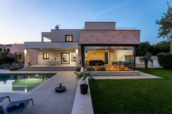 Porec modern house with a private pool, located just 3 km from the Adriatic Sea, offers a refined blend of contemporary architecture, lifestyle-driven design, and strong investment appeal. Set on a 751 square meter parcel, the villa provides 280 square meters of thoughtfully planned living space, positioned within one of the most desirable areas of Croatia’s Istrian peninsula.Bathed in a mild Mediterranean climate, Porec sits along the western Istrian coast, celebrated for its preserved natural landscapes, manicured parks, pine and oak forests that stretch to the shoreline, and a coastline defined by clear waters, beaches, coves, and small islands. With the character of a vibrant coastal city, Porec is recognized as a cultural, sports, and tourism hub, seamlessly merging historic heritage with modern infrastructure. The UNESCO-listed Euphrasian Basilica anchors the old town, while contemporary resorts, marinas, and amenities define its present-day appeal. Beyond its reputation as a summer destination, Porec is widely regarded as a year-round city designed for quality living, offering safety, urban comfort, and a progressive approach to community life.Situated in a quiet residential suburb of Porec, this modern villa for sale is surrounded by nature, family homes, and high-quality holiday residences, creating a sense of privacy while remaining close to the sea and the city’s full range of services. The location delivers everyday convenience without sacrificing tranquility, making it equally attractive for permanent residence or a high-performing rental property.The house is defined by clean lines and contemporary architectural language that complements rather than dominates its natural surroundings. Designed as a single residential unit, the layout unfolds across two levels. The ground floor features an open-plan living area that connects the living room, dining space, and kitchen, alongside a bedroom with en-suite bathroom, a children’s playroom, an additional bathroom, and storage. Upstairs, three bedrooms and two bathrooms are complemented by two terraces offering open views across the landscape, extending toward the sea.The landscaped and fully enclosed garden is carefully designed to enhance privacy and atmosphere, with a heated swimming pool and sun deck forming the focal point of outdoor living. Quality construction, modern materials, and a well-balanced floor plan ensure long-term comfort and durability.With its prime location near Porec, contemporary design, private pool, and proximity to the sea, this property represents an ideal opportunity for family living as well as a compelling investment in the Istrian luxury real estate market, particularly for premium tourist rental demand. Ref: RE-U-44948Overall additional expenses borne by the Buyer of real estate in Croatia are around 7% of property cost in total, which includes: property transfer tax (3% of property value), agency/brokerage commission (3%+VAT on commission), advocate fee (cca 1%), notary fee, court registration fee and official certified translation expenses. Agency/brokerage agreement is signed prior to visiting properties.