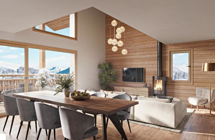 Au niveau inférieur, l'espace de vie s'articule autour d'un séjour lumineux avec cuisine ouverte, véritable coeur de l'appartement. Une chambre, une salle d'eau, des Wc indépendants et de nombreux rangements complète ce niveau. Le séjour s'ouvre sur un balcon de 11,68 m², idéal pour profiter de l'environnement alpin.