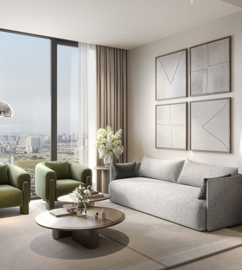 The architecture features clean lines and panoramic glazing that open views of green landscapes and the dynamic urban skyline. The development offers studios and 1-, 2-, and 3-bedroom apartments. Interiors are designed in natural tones, using high-quality materials and ergonomic layouts that create an atmosphere of comfort and visual harmony. Every detail is carefully considered — from soft lighting to refined finishes, highlighting modern style and functionality.