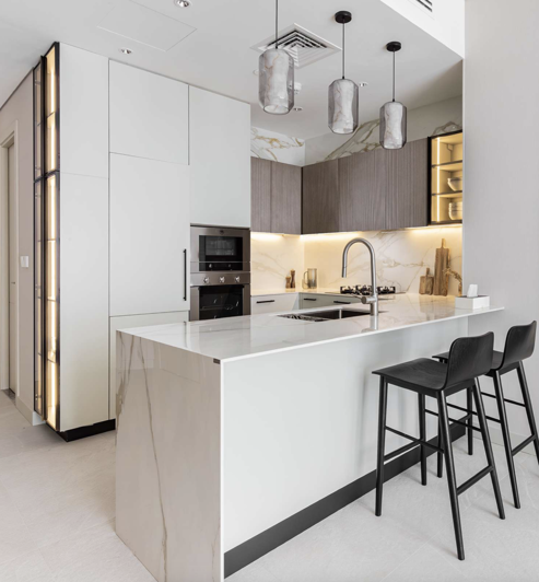 The complex consists of a basement level, a ground floor, five podium levels, twenty residential floors with apartments, and a roof. Available units include one- and two-bedroom apartments, thoughtfully designed with ergonomic layouts and floor-to-ceiling windows that fill the spaces with natural light.