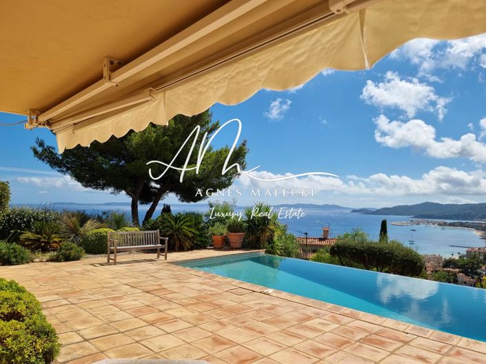 EXCLUSIVELY With Agence Agnès Malecki ! Overlooking the Mediterranean, this Provençal villa perfectly embodies the art of living by the sea. Here, every opening becomes a living canvas, revealing the Îles d’Or, the port of Bormes, the legendary Cap Bénat, and the ever-changing lights of Le Lavandou. Set on a 1,230 m2 plot with Mediterranean essences, the property offers 182 m2 of living space, designed to combine comfort and elegance. On the main level, the vast living area opens onto a 190o terrace suspended above the sea, a true belvedere over the horizon. Two bedrooms with their private bathrooms and an office complete this floor dedicated to serenity. On the garden level, bathed in natural light, a convivial kitchen with dining area opens onto a large terrace, perfect for summer evenings. Two additional bedrooms with bathrooms, a laundry room, and a cellar bring both functionality and comfort. Outdoors, the infinity pool merges seamlessly with the sea, offering a breathtaking sense of endlessness. Expansive lounging areas invite relaxation, while the terraces shift with the rhythm of the seasons. The landscaped garden, fully planted with trees, wraps the property in a refined and peaceful atmosphere. A double garage, outdoor parking spaces, a turnaround area, and reversible air conditioning complete the amenities of this turnkey villa, conceived as a rare retreat where luxury meets discretion.