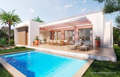 Au cœur du complexe résidentiel établi de Vistabella Golf, ces villas contemporaines allient confort, style et emplacement privilégié. Conçues pour accueillir aussi bien des séjours de vacances qu’une occupation à l’année, elles profitent de l’ensemble des services du resort, comprenant commerces, restaurants et parcours de golf 18 trous, tandis que les villes et villages voisins offrent des commodités supplémentaires. Les plages Pavillon Bleu sont accessibles en seulement 20 à 30 minutes de route, et les aéroports d’Alicante-Elche et de Murcie se trouvent à environ une heure.Les acquéreurs peuvent choisir entre deux configurations. La villa de 3 chambres et 2 salles de bains est organisée sur un seul niveau, avec un espace de vie ouvert donnant sur une terrasse couverte par pergola, une terrasse sur le toit privée et un accès direct à la piscine et au jardin. La villa de 4 chambres et 3 salles de bains est construite sur deux niveaux, la suite parentale occupant l’étage supérieur avec salle de bains attenante, dressing et terrasse privée.Les deux modèles disposent de grandes baies vitrées et de portes coulissantes qui relient harmonieusement les intérieurs aux espaces extérieurs. La cuisine est équipée d’électroménagers, et sont inclus la climatisation gainable, des volets roulants électriques, des salles de bains complètes, un éclairage extérieur ainsi qu’une pré-installation pour cuisine d’été (dans les maisons avec terrasse sur le toit). Les jardins paysagers sont complétés par une piscine privée et une place de stationnement sur la parcelle, offrant un équilibre parfait entre détente et fonctionnalité.Avec leur design moderne, leurs façades blanches rehaussées de détails effet bois et leur situation idéale dans une communauté sécurisée et conviviale, ces villas représentent un excellent choix pour profiter du style de vie méditerranéen. Notre sélection de villas à Vistabella Golf est disponible pour visite — contactez-nous pour plus d’informations.