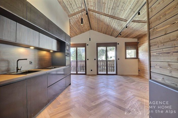 D'une surface de 66 m², ce bien se compose d'une belle pièce de vie avec cuisine haut de gamme entièrement aménagée et équipée, ouverte sur un balcon orienté montagne.