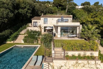 Située en position dominante, au calme et au sein d'un domaine fermé, cette propriété complètement rénovée avec des matériaux de qualité bénéficie d'une superbe vue panoramique sur la mer, le village de Saint-Paul-de-Vence et le Cap d'Antibes.