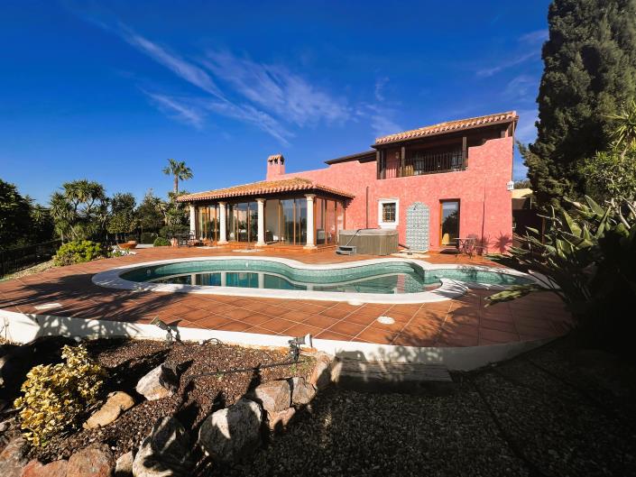 Folding doors open into a beautifully bright and airy sunroom, featuring double glazing and sliding doors. These lead onto a meticulously maintained terrace, which provides impressive views of the pool, garden, and adjacent golf course. There is a hot tub to enjoy leisurely moments after a round of golf. The property comprises four bedrooms, including two with ensuite facilities, as well as a family bathroom and an additional washroom.