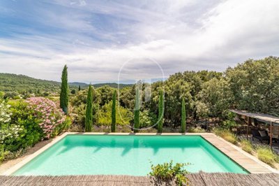 À l'extérieur, le terrain de plus de 5 500 m² offre de multiples espaces de détente aménagés sous les chênes verts, un potager, un bois privé et une piscine nichée à l'abri des regards.