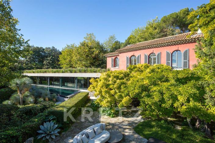 Exclusivité, Villeneuve-lès-Avignon. Propriété signée par l'architecte Rudy Ricciotti de 600m2 nichée dans la végétation avec vue sur le Palais des Papes. Bastide d'origine du XIXème comprenant un étage parental avec chambre en suite, dressing, salle de sport, vue sur Avignon et les Alpilles. A l'étage inférieur une suite, et un salon de réception donnant sur terrasse surplombée d'une glycine centenaire. Dans la partie contemporaine un vaste espace de vie de plain pied avec une cuisine ouverte Boffi by Mouvement, donnant sur la piscine et la verdure. A l'étage inférieur un grand bureau, 3 chambres en suite ouvertes sur l'extérieur, grande buanderie, cave à vin. Une dépendance sur la partie basse du terrain, avec 2 garages fermés, parking extérieur 4 voitures. Prestations très haut de gamme, environnement privilégié. Possibilité d'acquérir en sus un garage de 10 Box.