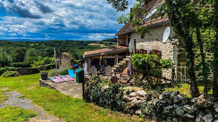 À l’extérieur, le charme opère tout autant. La terrasse couverte constitue un endroit idéal pour profiter des longues soirées d’été, avec vue sur les collines environnantes. Plusieurs dépendances autour de la maison offrent des espaces de rangement pratiques. Le terrain d’environ 1,7 hectare comprend également une ancienne ruine, contribuant au caractère authentique et champêtre de l’ensemble.