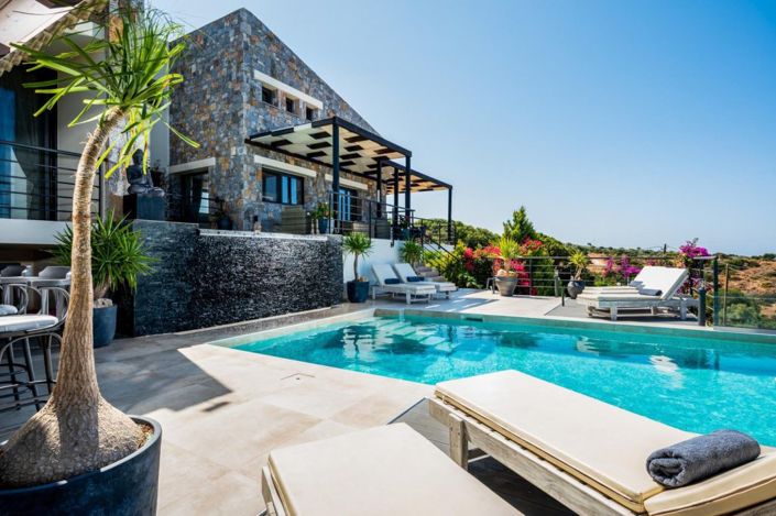A stone-built modern villa with a private pool offering breathtaking sea and mountain views.