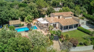 Dans quartier très résidentiel au calme en position dominante avec une belle vue dégagée collines et aperçu mer, spacieuse et lumineuse villa récemment rénovée bénéficiant de généreux volumes.