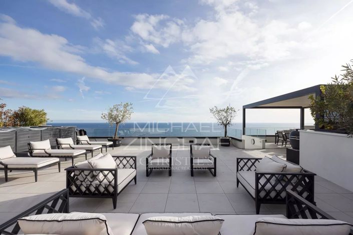 Idéalement situé à Roquebrune-Cap-Martin à pied de Monaco, dans une résidence neuve, et sécurisée avec gardien, bénéficiant d'une piscine à débordement, magnifique penthouse offrant une vue panoramique sur la mer et Monaco.