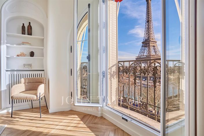 Exposé Sud, cet appartement ensoleillé vient de faire l'objet d'une rénovation de qualité et est proposé meublé et décoré, prêt à vivre. Trois balcons offrent des vues sur la Seine et la Tour Eiffel.