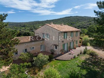 La propriété comprend un mas en pierre d’environ 220 m² de surface habitable, agrémenté d’un espace nuit indépendant, dénommé “La Bergerie”, parfait pour accueillir vos invités. Vous bénéficierez également d’un garage/atelier de 80 m² et de plusieurs terrasses, tandis qu’un ancien héliport a été transformé en terrain de rrière le portail, la bâtisse en pierre se dévoile dans toute sa splendeur. Elle se compose de quatre chambres et de deux espaces de couchage en mezzanine. En entrant dans le hall, qui dessert les pièces de vie, l’aménagement sobre met en valeur l’âme des lieux, avec de belles hauteurs sous plafond, des plafonds à la provençale, des terres cuites au sol et la pierre apparente. Le salon, très lumineux, est équipé d’un poêle à bois et s’ouvre plein sud sur la terrasse couverte et la nature environnante. La cuisine, plus traditionnelle et fermée, possède une charmante cheminée décorative, tandis qu’une arrière-cuisine spacieuse permet un accès pratique au garage.Prestations et équipements : eau de ville, fosse septique, chauffage électrique par radiateurs connectés, poêle à bois, éclairage de jardin, menuiseries Pvc, fibre optique.