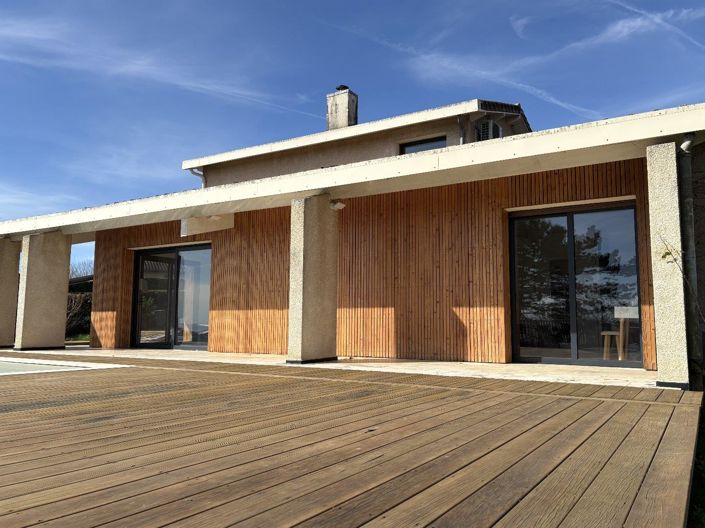 Le grand jardin de 2800m2 ceinture la maison qui profite également d'une belle terrasse avec vue dans laquelle est intégrée la piscine. Enfin il convient de mentionner la cuisine d'été avec vue.
