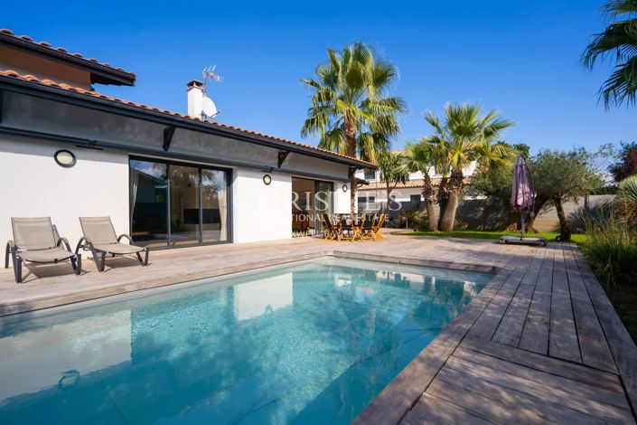 Elle offre un bel espace de vie composé d’un vaste séjour, d’une salle à manger et d’une cuisine indépendante, le tout donnant sur la terrasse et la piscine, exposée Sud.