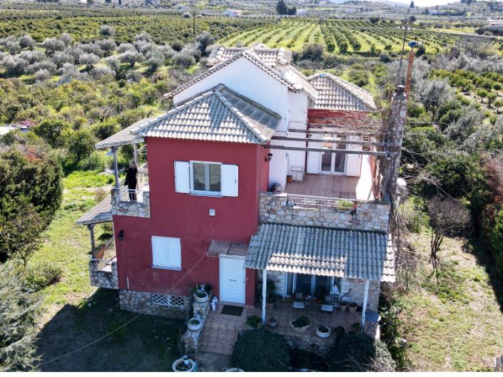 Just 5km from Nafplio, on the outskirts of Agios Andrianos village, this charming three-bedroom home sits on a 4,200m² plot, offering the perfect balance of peace and convenience. The ground floor includes a spacious open-plan living–dining–kitchen area, one bedroom and a modern bathroom, while the upper floor features two additional bedrooms and a second bathroom. A 40m² attic provides flexible space for a fourth bedroom, home office, or playroom. Outdoors, the property benefits from a beautifully maintained garden with lawn, ample space for family use or a potential swimming pool, while the remaining land is planted with orchards and fruit trees. A private driveway leads to the parking area, the kitchen entrance, and a large basement storage room. The home enjoys spectacular 360° panoramic views of the Argolida plains, Acronafplia, Palamidi Fortress, Argos Castle, and the surrounding hills. Only six minutes from Nafplio town, close to all amenities, less than 10km from beaches, and under two hours from Athens International Airport, this property presents a rare opportunity for comfortable country living near the coast.