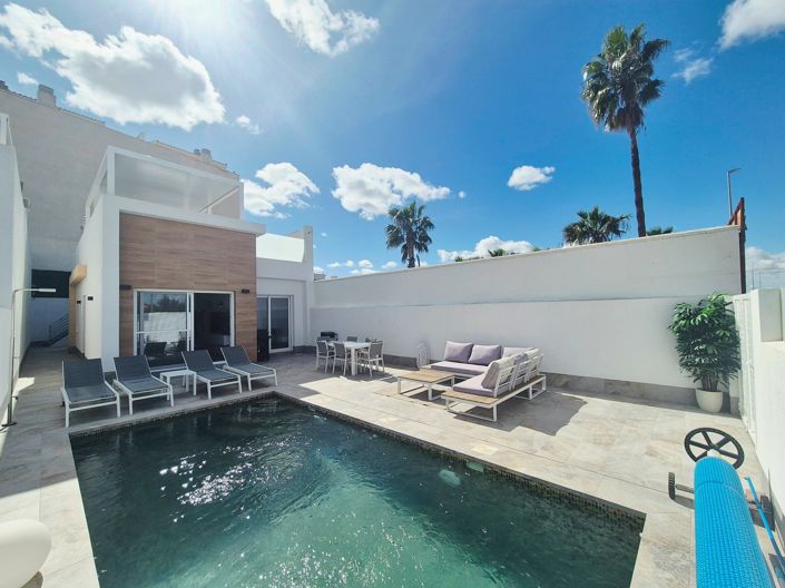 En entrant dans la propriété clôturée, vous êtes accueillis par une terrasse avant ensoleillée avec une grande piscine privée chauffée avec une cascade. L'accès se fait soit par la porte principale située sur le côté de la propriété, soit par les portes-fenêtres coulissantes en verre qui mènent directement à l'espace de vie. Conçue avec style et selon un concept ouvert, la zone de vie s'étend jusqu'à la cuisine entièrement équipée avec un bar de petit-déjeuner intégré, de nombreux espaces de rangement et des appareils électroménagers intégrés.