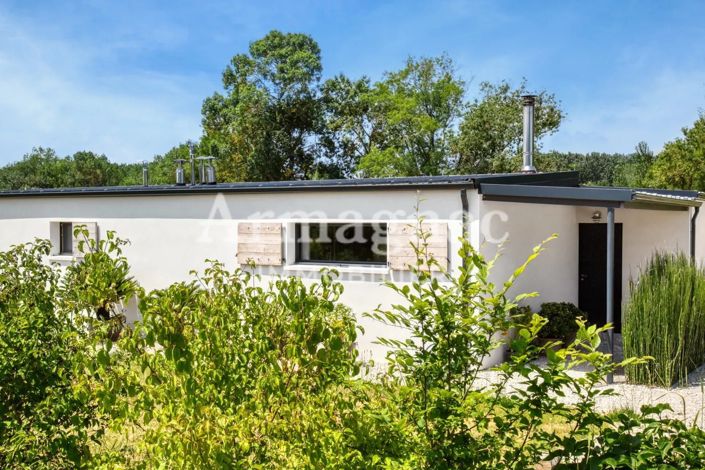 Armagnac-Immobilier vous propose, en exclusivité, dans un environnement résidentiel calme et privilégié, cette maison contemporaine de plain-pied, dessinée par une architecte et construite en 2017. D'une surface d'environ 90m² habitables, elle offre un cadre de vie alliant confort, esthétisme et qualité des matériaux, sur une parcelle de 4 193m².
