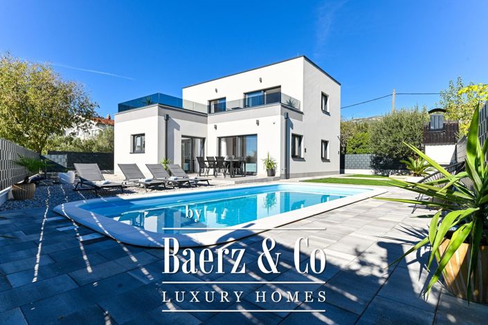 Kaštela, a modern house with an outdoor pool built in 2025, located on a plot of 490 m2. It is divided into two floors, with a total area of 160 m2.The ground floor is divided into a fully equipped kitchen with a dining room, a living room, a laundry room, a toilet and one bedroom with a bathroom, while the first floor has two bedrooms with their own bathrooms and access to a large terrace with a sea view.The fully fenced and landscaped garden hides a swimming pool, a sunbathing area, a social area and a barbecue.The location is good for living, accessible, and all necessary amenities are nearby.For any additional information, we are at your disposal.