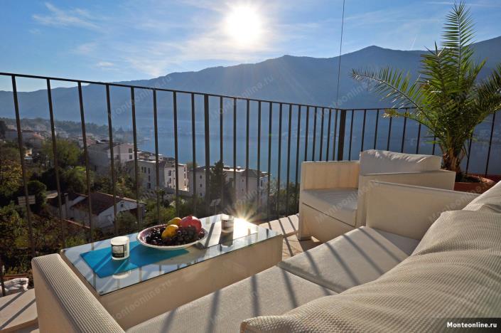 The main highlight is the breathtaking panoramic view of the Adriatic Sea, mountains, and Dobrota, which opens from the terrace and creates the feeling of a premium resort residence.