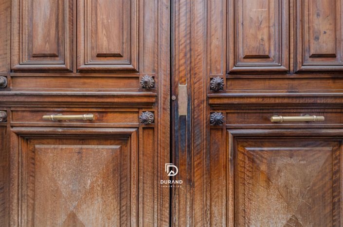 L’accès se fait par une porte cochère monumentale en bois, ouvrant sur un hall d’entrée à l’allure presque institutionnelle, marqué par ses volumes, ses colonnes, ses moulures et ses sols en marbre ornés de motifs géométriques qui témoignent du soin apporté à la construction de l’immeuble.