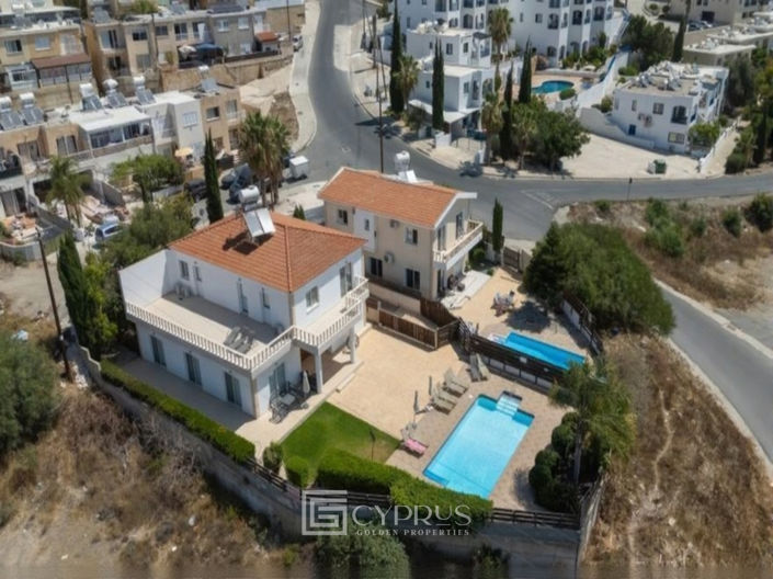 This 5-bedroom villa sits in lower Chloraka, Pafos, offering a blend of luxury and location. The ground floor hosts the entrance, dining room, two living rooms, kitchen, two bathrooms, kitchenette, and one guest bedroom. The first floor features four bedrooms and two bathrooms, with the master bedroom en-suite and a utility room on the top level. A total of 300 m2 of covered area and 80 m2 of verandas sit on an 800 m2 plot. Access is via a private road and electric gate. Amenities include a private swimming pool, fully fitted kitchen, laundry room, double-glazed windows, air conditioning, and provision for central heating. A store room, fly screens, jacuzzi, pool shower, and open parking enhance convenience. Enjoy stunning sea and mountain views while being just moments from the center of Pafos.