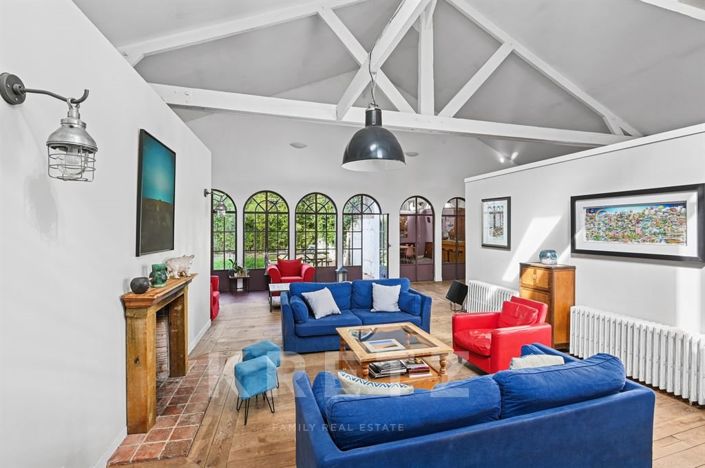 La pièce de réception de 110 m², sublimée par une charpente apparente, une hauteur sous plafond de plus de 6 mètres et une verrière inondant l'espace de lumière, s'ouvre largement sur une terrasse/jardin de plain-pied et sans vis-à-vis. Une cuisine ouverte et espace bar complètent ce lieu de vie conçu pour recevoir.