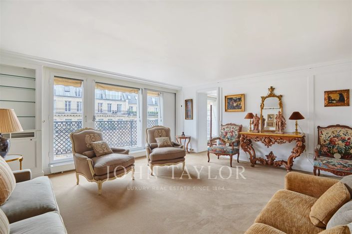 Le large balcon filant prolonge harmonieusement les pièces de vie et dévoile une superbe vue sur la Tour Eiffel ainsi que sur les tours de l’Église Saint-Sulpice — un panorama rare au cœur de la Rive Gauche.