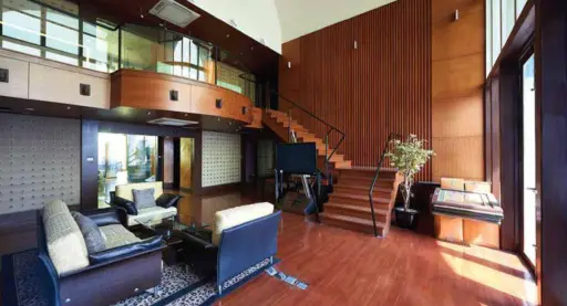 A true mansion in the sky on the 37th floorThis place is rare—1400 sqm of space, so much bigger than your usual Bangkok condo. You get four bedrooms and three bathrooms laid out over a unit that feels more like a low-rise home vertically stacked. The high ceilings and large windows flood the living area with natural light, making it the spot you'll probably spend most of your time.One of the standout features is the large wooden staircase with modern metal handrails connecting the mezzanine, which adds a real architectural wow-factor alongside the wooden paneling and glossy wooden floors. The seating area is cozy yet sophisticated, complete with a glass coffee table and plenty of space for indoor plants, creating a homey yet contemporary vibe.There are multiple balconies running around the unit with glass railings, offering 360-degree views of Bangkok—perfect for morning coffee or evening sunsets. For relaxing, the built-in jacuzzi bathtub with skylight makes a great retreat. The unit also comes with some impressive extras like a private swimming pool, gym, and even a cinema room, plus four private elevators which is super convenient.It’s a resale and will need some updating, but for a buyer wanting expansive space and privacy in the heart of Sathon, this is a rare opportunity.
