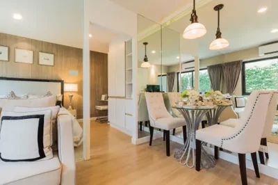 Welcome to this practical yet stylish 2-bedroom condo in Khlong Toei.At 52 sqm, it’s got a nice open-plan layout that really helps the space feel bigger—perfect if you like having room to move without feeling lost. The wooden floors throughout add warmth, and you’ll probably spend a lot of time in the spacious living area, which looks out onto a peaceful garden view. That kind of natural light streaming in through the large windows really lifts the whole place.The dining area is simple but elegant, featuring a glass-topped round table with an eye-catching metal base, paired with four comfy upholstered chairs trimmed with subtle nailhead details. It’s an easy spot for dinner or even working from home.Storage’s thoughtfully done with a built-in white cabinet and open shelves that blend functionality and style. The bedrooms come with neutral palettes and built-in headboards, bedside lamps, plus soft decorative touches like pillows and a rug to make it feel cozy. You’ll find air conditioning units above the windows to keep things cool.Overall, it’s a bright, contemporary space with a relaxed vibe and practical features—ideal if you want something move-in ready with good natural light and that little bit of extra elegance without going over the top.