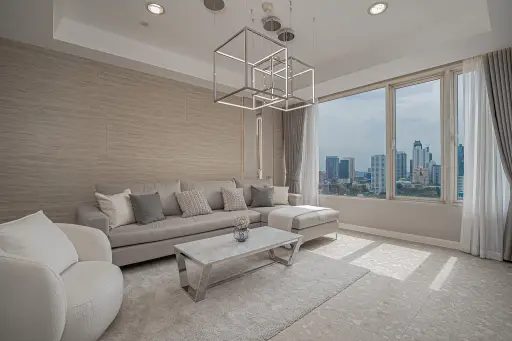 A comfortable blend of space and styleThis 164 sqm condo feels surprisingly roomy and practical for a Bangkok address, especially with three bedrooms and bathrooms—great if you want your own space or have a family in mind. You'll probably spend most of your time in the living room: it’s bright thanks to large floor-to-ceiling windows offering city views and a spacious layout that fits an L-shaped sofa and a cushioned armchair comfortably. The dark wooden floors add warmth and contrast nicely with the neutral walls and textured paneling behind the TV wall.Details that make a differenceThe setup is thoughtfully modern without being cold. Floating desks and shelving keep things minimalist but functional, and there’s plenty of clever storage with built-in shelves lit from within—ideal for showing off books or décor. The dining area is versatile, featuring both a wooden bench and upholstered chairs around a glass table under stylish pendant lights, so it works just as well for casual dinners or something a bit more formal.Bedrooms come with practical touches like a walk-in closet and vanity area, making everyday routines feel a bit more special. Overall, this place balances comfort, style, and function well. It’s freehold and resale, so you’re getting a solid space ready to move into without fuss.