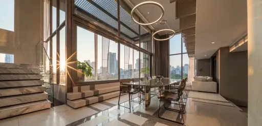 Penthouse in Central Phrom PhongThis 388 sqm condo offers three bedrooms and four bathrooms, so it's perfect if you want plenty of space and privacy for everyone. The bedrooms feel generous and well-lit, thanks to the floor-to-ceiling windows with horizontal blinds that let in natural light but also offer control over your privacy.Indoor Meets OutdoorOne of the standout features is the outdoor dining area. It’s got a charming wooden dining table with six matching chairs, nestled among lush greenery and several trees. The patio, enclosed by low concrete walls and featuring concrete flooring, creates a peaceful and private outdoor spot right at home. There's even a small adjoining shed for extra storage or flexibility.Elegant, Practical FinishesInside, the design uses a neutral palette, mixing dark marble with white veining and warm wood textures, which gives it a refined yet inviting feel. The bathrooms are especially impressive: think freestanding round white bathtubs with gold faucets, large marble tiles, floating vanities, and clever recessed lighting. The master bath has a classy glass partition and backlit mirrors that make the space feel modern but serene.Overall, this place balances luxury, comfort, and privacy in a bustling Bangkok neighborhood—definitely worth seeing if you want something spacious with a great indoor-outdoor flow.