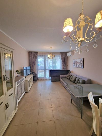 The apartment with a total area of 62.05 m² is located on the ground floor. It consists of a hallway, a living room with a kitchen area, a bathroom, and a large terrace. The apartment is furnished with high-quality furniture and all necessary appliances. It offers a view of the complex's grounds.