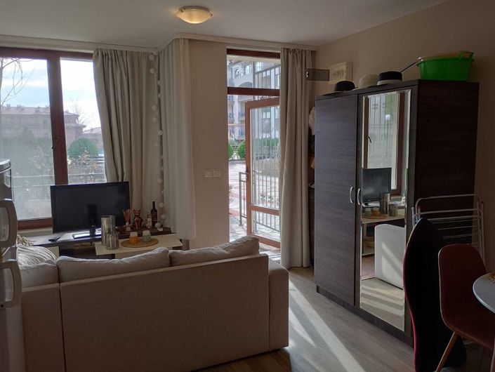 The studio is equipped with a sofa, TV, wardrobe, and a beautiful exit to the patio area of the complex. It features a dining area with a table and chairs, a fridge, a microwave, air conditioning, and shelves. The kitchen is equipped with an oven and other kitchen appliances. In the corner, there is a double bed suitable for sleeping, and there is a bathroom with a shower cabin.