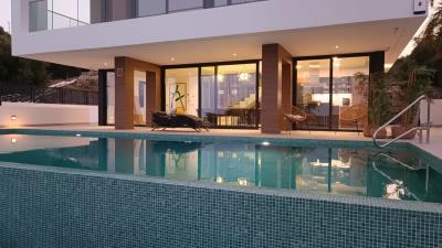 This newly built contemporary villa, situated in the prestigious enclave of Valle Romano Golf just west of Estepona, offers a sophisticated Mediterranean lifestyle defined by modern elegance and indoor-outdoor synergy. The property is a masterpiece of contemporary architecture, characterized by clean lines, expansive glass walls, and a minimalist white facade designed to maximize natural light. The main floor serves as the heart of the home, featuring a bright, open-plan living and dining area centered around a state-of-the-art INKO kitchen fully equipped with premium Gaggenau appliances. This level is designed for effortless hosting, providing direct access to both covered and open terraces, a private pool, and a dedicated BBQ area.