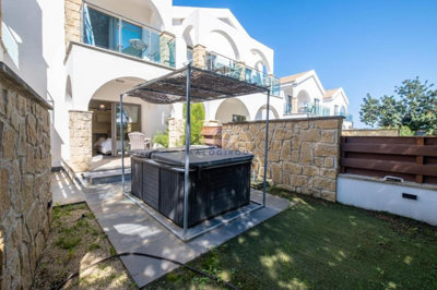 The apartment has a covered area of 28sqm and a covered veranda of 4sqm. It is situated on the ground floor. It consists of an open plan area with kitchenette, sitting area, a double bed, a bathroom with toilet, private garden and jacuzzi.