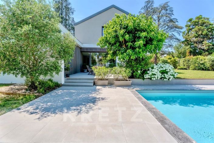 À Charbonnières-les-Bains, cette réalisation contemporaine signée Dank Architectes (2013) se distingue par son architecture affirmée, ses prestations de haut niveau et un parti pris végétal unique : un majestueux arbre traverse la toiture, véritable colonne vertébrale du projet, liant intérieur et extérieur avec force et poésie. Édifiée sur un terrain paysagé de 2 045 m² avec piscine de 13,5 x 5 m, terrain de pétanque et arrosage automatique, elle offre un cadre de vie aussi rare que privilégié. Développant 337 m² Carrez (511 m² au sol) sur trois niveaux, la maison propose une pièce de vie de 110 m² orientée plein sud, avec cuisine équipée, 6 chambres dont une suite parentale, 3 salles d'eau aux finitions soignées et un bureau indépendant. Le confort est assuré par une pompe à chaleur géothermique, une climatisation réversible, une Vmc double flux reliée à un puits canadien, une cheminée au gaz Belfire, un ballon thermodynamique, un adoucisseur d'eau et une aspiration centralisée. En sous-sol, 107 m² supplémentaires accueillent une cave, un local technique pour la piscine et de vastes rangements. Un garage double de 55 m² ainsi que 4 stationnements extérieurs sécurisés par un portail motorisé complètent ce bien d'exception. Une propriété familiale où se conjuguent exigence architecturale, innovations techniques et nature intégrée au coeur de l'habitat.
