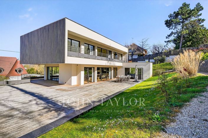 A seulement 20 minutes de la porte de Vincennes, nichée dans un parc privé et très calme sur les bords de Marne, cette très belle villa d’architecte en parfait offant 318m2 habitables (561 au sol) distribués sur 3 niveaux, le tout entouré de 250m2 de terrasses et d'un jardin paysager de 1673m2.
