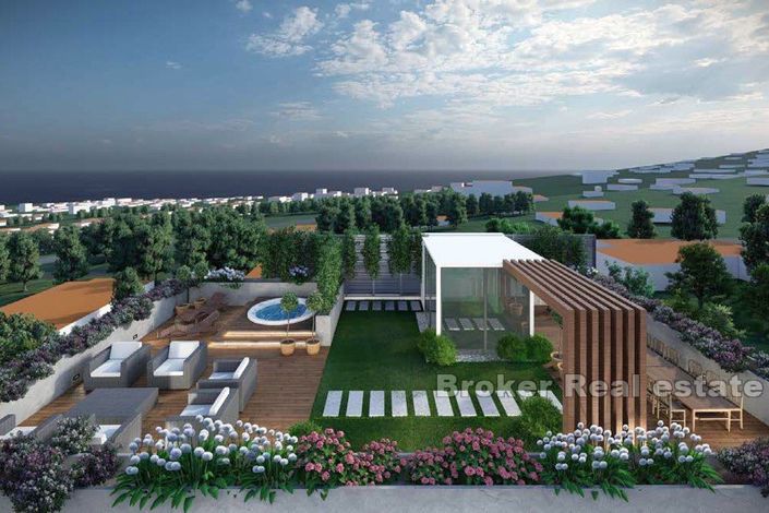 Each villa will spread over two floors and consist of a kitchen and living room, a hallway, a toilet, a laundry room and a storage room on the ground floor and a hallway leading to four bedrooms with their own bathrooms on the first floor. Each of these rooms will have access to a spacious balcony. In the environment, there will be a veranda and a spacious terrace, as well as a private swimming pool and sunbathing area and there will also be provided access to the roof terrace where a massage tub, garden, summer kitchen and lounge are planned.