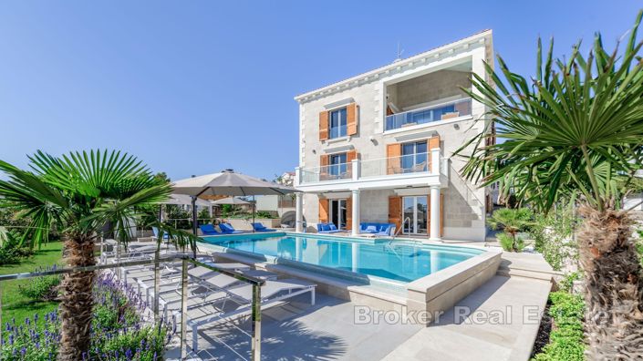Neuf pierre Villa avec piscine à débordement à seulement 50 m de la mer. Le Villa est situé dans le quartier résidentiel de Rogoznica, entouré de luxueuses villas Neuf. La façade extérieure de la Villa est entièrement faite de 3 types de pierre taillée à la main, le travail des meilleurs maçons de l'île de Brac La Villa est répartie sur 5 étages: Le sous-sol est conçu comme une salle pour socialiser avec un Cheminée, cet étage est également conçu comme une petite zone spa avec un sauna et un jacuzzi. Du sous-sol, on accède à la cour, où se trouve un Jardin magnifiquement aménagé en style méditerranéen, et un Piscine spacieux de 60m2 avec son propre espace de bronzage. Rez-de-chaussée Il se compose d'un couloir, d'un escalier, de 3 chambres où chaque chambre dispose de sa propre salle de bain, Balcon, d'une entrée et de deux terrasses. Dans cette Rez-de-chaussée il y a aussi une Garage et une buanderie. LE PREMIER ETAGE qui est accessible par un escalier intérieur, est constitué d'un couloir, d'une toilette, d'une chambre avec salle de bain, d'une cuisine, d'une salle à manger et d'un salon à plafonds élevés, et d'un Terrasse couvert avec une belle vue sur la mer