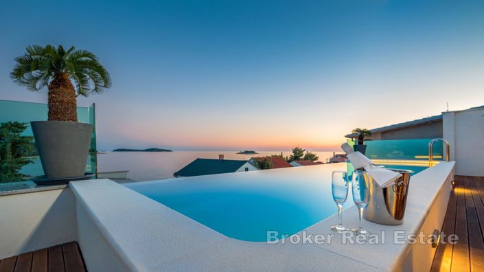 Ce luxueux Villa est situé au cœur de la Dalmatie, dans une ville touristique chaleureuse et paisible de Rogoznica, à proximité de toutes les destinations culturelles et historiques de la Dalmatie, telles que Šibenik, Trogir, Split et les parcs nationaux de Kornati et Krka. Le Villa est composé de Rez-de-chaussée, 1er et 2e étage (390 m2), possède 5 chambres avec salle de bain privée, capacité totale de 10 personnes. Sur le Rez-de-chaussée, il y a une cuisine avec une salle à manger pour 10 personnes, 2 chambres avec salle de bain privée, une toilette supplémentaire avec machine à laver et un Terrasse avec une table à manger pour 10 personnes. Au premier étage, il y a 3 chambres avec salle de bain privée, salon, Terrasse avec meubles pour sièges et Vue mer. Au deuxième étage, il y a une zone de loisirs et de détente qui comprend un magnifique Terrasse avec une piscine à débordement (7,80 m x 2,30 m), un jacuzzi pour 4 personnes et des chaises longues d'où vous pourrez profiter d'une vue magnifique sur la mer Adriatique bleue. À l'intérieur, il y a un sauna avec douche, 2 toilettes, et un billard, un foot de table, des fléchettes et une petite cuisine. Le Villa est situé au bout d'une petite rue locale (pas de circulation devant), dans une belle baie, à seulement 50 m de la plage.