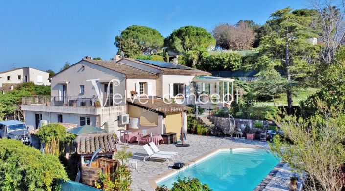 A Biot, à pied du village, en position dominante et au calme absolu, charmante villa lumineuse de 220m² sur terrain arboré de 1.400m² comprenant :