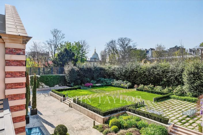 Il dispose de l'un des plus grands jardins privés de Paris (1069 m2), d'une immense piscine avec lumière naturelle et offre de magnifiques vues plein soleil sur le dôme des Invalides et le haut de la Tour Eiffel, sans aucun vis à vis.