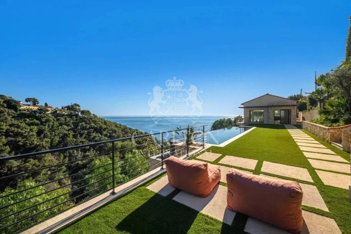À l’extérieur, la villa est entourée d’un agréable jardin paysager et de plusieurs terrasses bénéficiant d’un excellent ensoleillement. Une piscine à débordement chauffée ainsi qu’une grande plage piscine invitent à la détente tout en profitant pleinement de la vue mer.