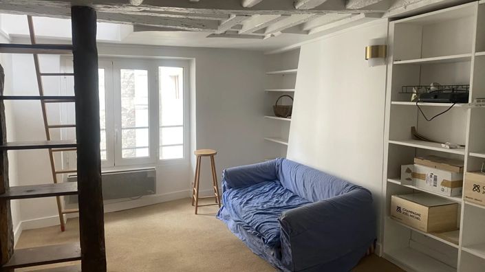 Appartement en duplex d’une superficie habitable d’environ 30 m2 situé dans un immeuble du XVIIèmle siècle. Au premier niveau du 4ème étage se trouve une pièce de vie avec un coin cuisine, une salle de bains et un accès par une échelle de meunier à la chambre qui se trouve à l’étage. L’Étage supérieur comprend une entrée également au 5 ème étage. Les deux lots pourraient être éventuellement séparés.